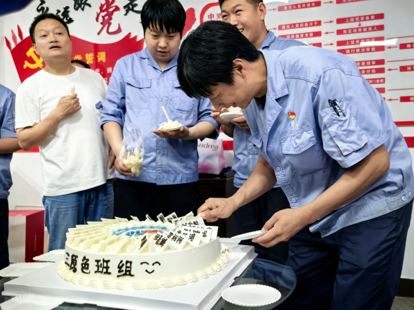學習結束后,就進入了第二個班組活動——回顧往昔,慶?!叭比龤q生日。磨工班組的成員們齊聲喊出“磨工班組三歲啦!”,有人趕忙去拿蛋糕,有人忙著搬桌子,還有人拆蛋糕包裝。組員彭高和高強小心翼翼地拿著蛋糕轉來轉去,認真找著合適的角度,想把這開心的一刻拍下來留作紀念。作為這個大家庭的一員,每個人都在用心為這場慶?;顒映隽Γ浞终宫F(xiàn)出團隊的凝聚力 。