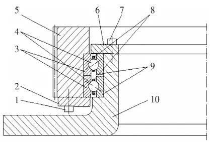 1—外圈壓板螺釘;2—外圈壓板;3—外圈;4—鋼球;5—軸承座;6—內(nèi)圈壓板;7—內(nèi)圈壓板螺釘;8—保持架;9—內(nèi)圈;10—CT機(jī)主軸。